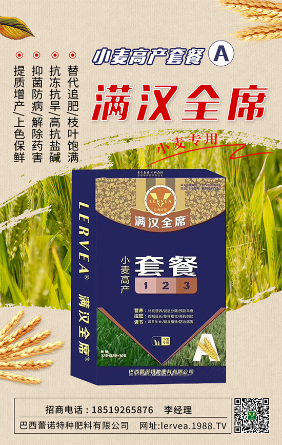 3、抓住小麥返青拔節(jié)的有利時機,及時采取促控措施,促進弱苗轉(zhuǎn)化,提高成穗率;控制旺長田塊,預(yù)防后期貪青倒伏。今天,小編為大家?guī)硪豢畎臀骼僦Z特種肥料有限公司的產(chǎn)品--小麥高產(chǎn)套餐A,能夠補充小麥生長的各種營養(yǎng)、調(diào)節(jié)小麥長勢,提高小麥抗病能力,為小麥高產(chǎn)保駕護航!