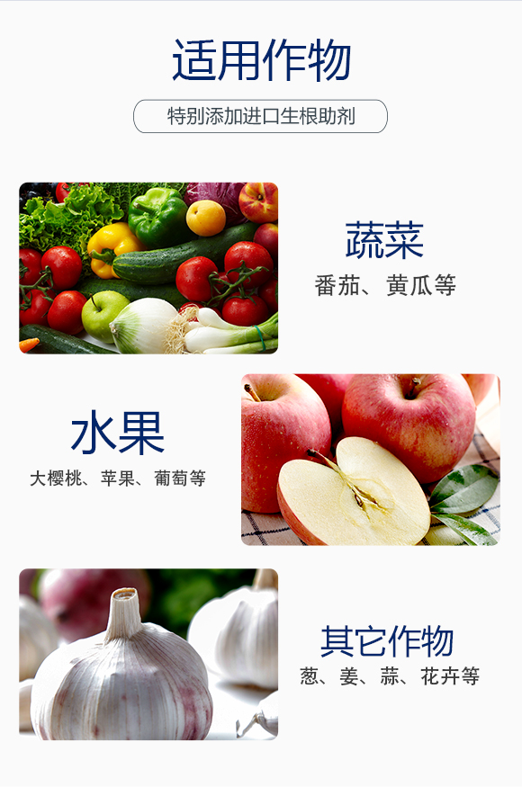 使用作物:適用于蔬菜、大櫻桃、蘋果、葡萄、蔥、姜、蒜、花卉等植物灌根葉噴