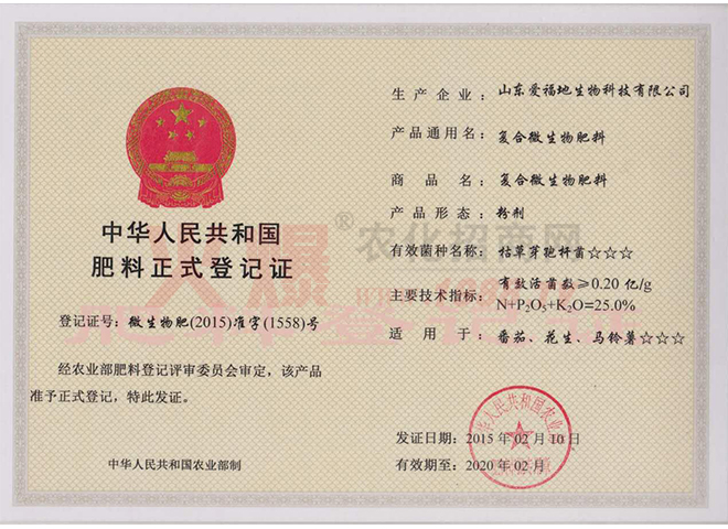 證書名稱:肥料正式登記證 發(fā)證機構(gòu):中華人民共和國農(nóng)業(yè)部